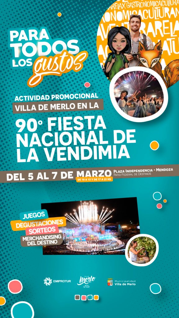En paralelo a la agenda institucional, se encuentra un Stand de Villa de Merlo en el Paseo Federal de Promoción Turística, ubicado en la emblemática Plaza Independencia de la ciudad de Mendoza. En el marco del 90° aniversario de la Fiesta Nacional de la Vendimia, el destino comparte espacio con localidades de todo el país del 5 al 7 de marzo.