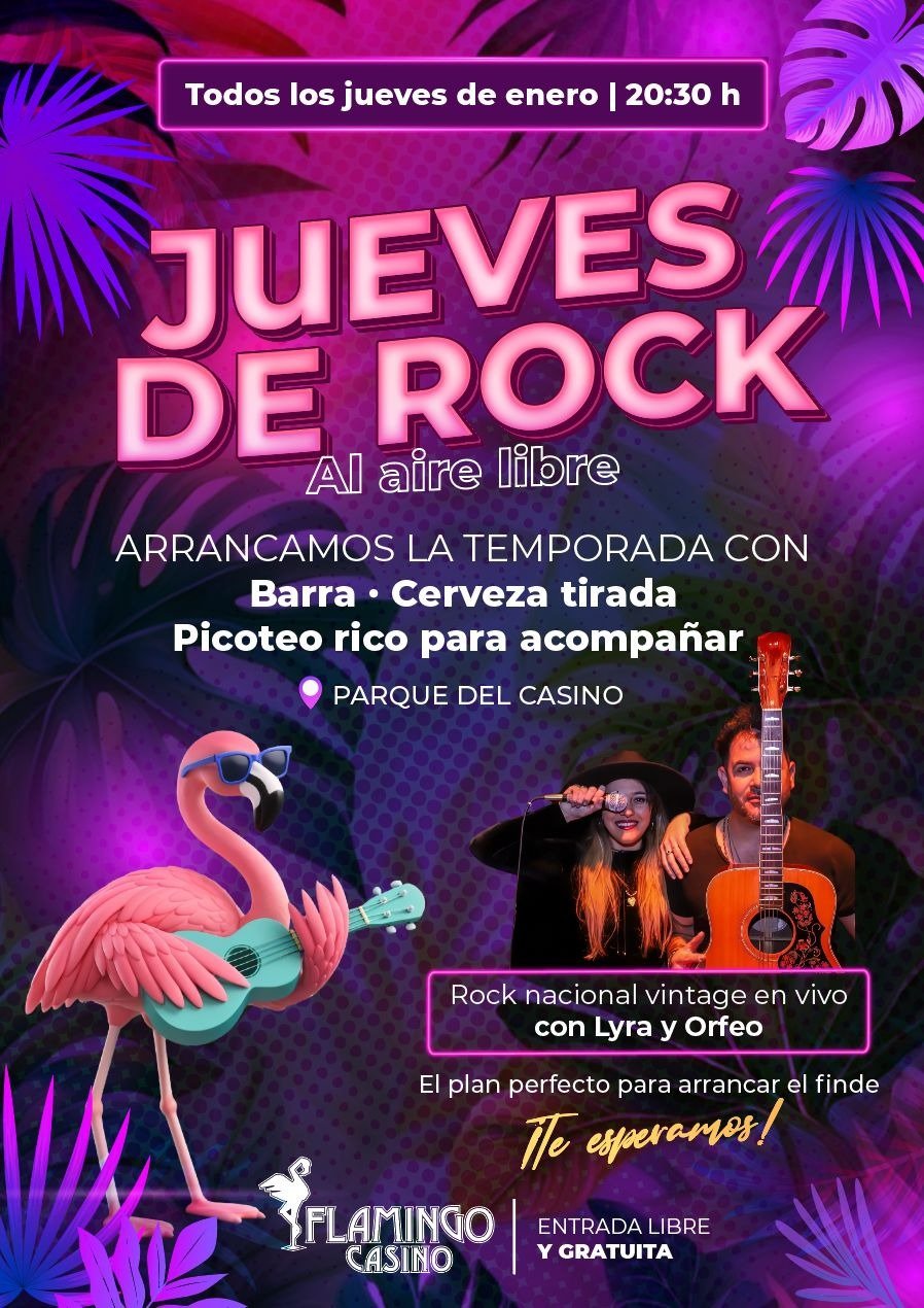 🎸 JUEVES DE ROCK 🎸🌴 Al aire libre 📅 Todos los jueves de enero🕣 20:30 h📍 Parque del Casino – Flamingo Casino Arrancamos la temporada con el mejor plan:🍺 Barra y cerveza tirada🍽️ Picoteo rico para acompañar🎶 Rock nacional vintage en vivo con Lyra y Orfeo ✨ Entrada libre y gratuita🎉 El plan perfecto para […] |