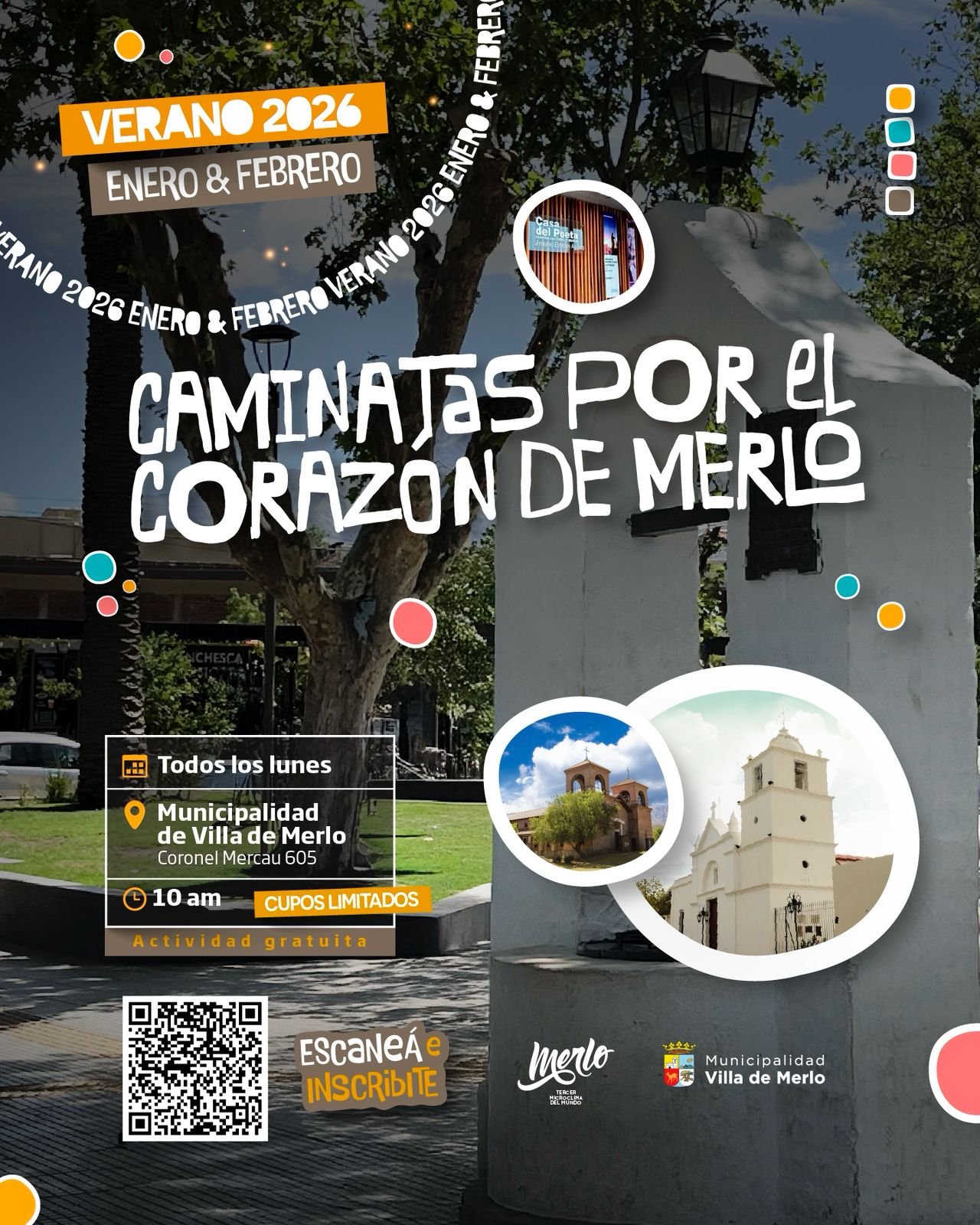 🌿 CAMINATAS POR EL CORAZÓN DE MERLO 🌿☀️ Verano 2026 – Enero y Febrero Te invitamos a recorrer y descubrir el corazón histórico y cultural de Merlo en una caminata guiada, ideal para disfrutar del verano. 📅 Todos los lunes🕙 10:00 hs📍 Municipalidad de Villa de Merlo📌 Coronel Mercau 605 ✅ Actividad gratuita⚠️ Cupos limitados […]