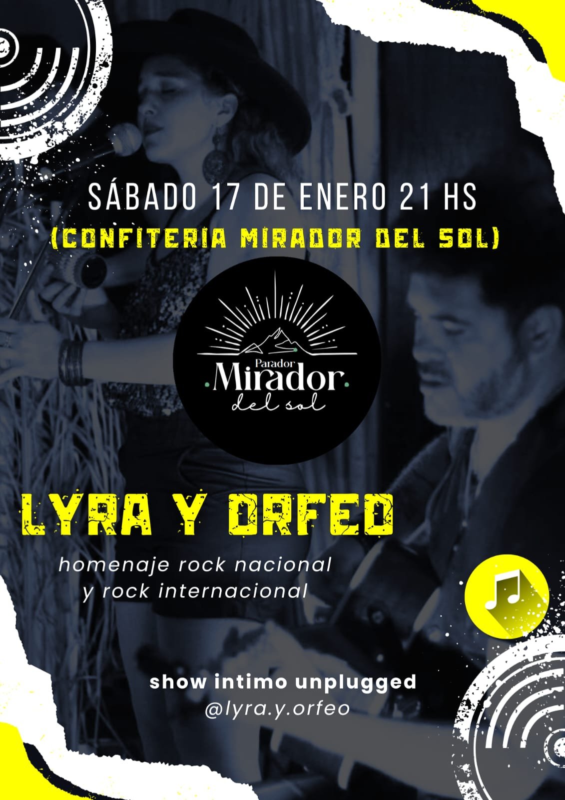 ✨ Estás invitado/a ✨ Este sábado 17 de enero a las 21:30 hs,Lyra y Orfeo te esperan con un show íntimo unplugged 🎶 📍 Confitería Mirador del Sol🎵 Homenaje al rock nacional e internacional Vení a disfrutar una noche de buena música y energía compartida.¡No te lo pierdas! 👉 @lyra.y.orfeo