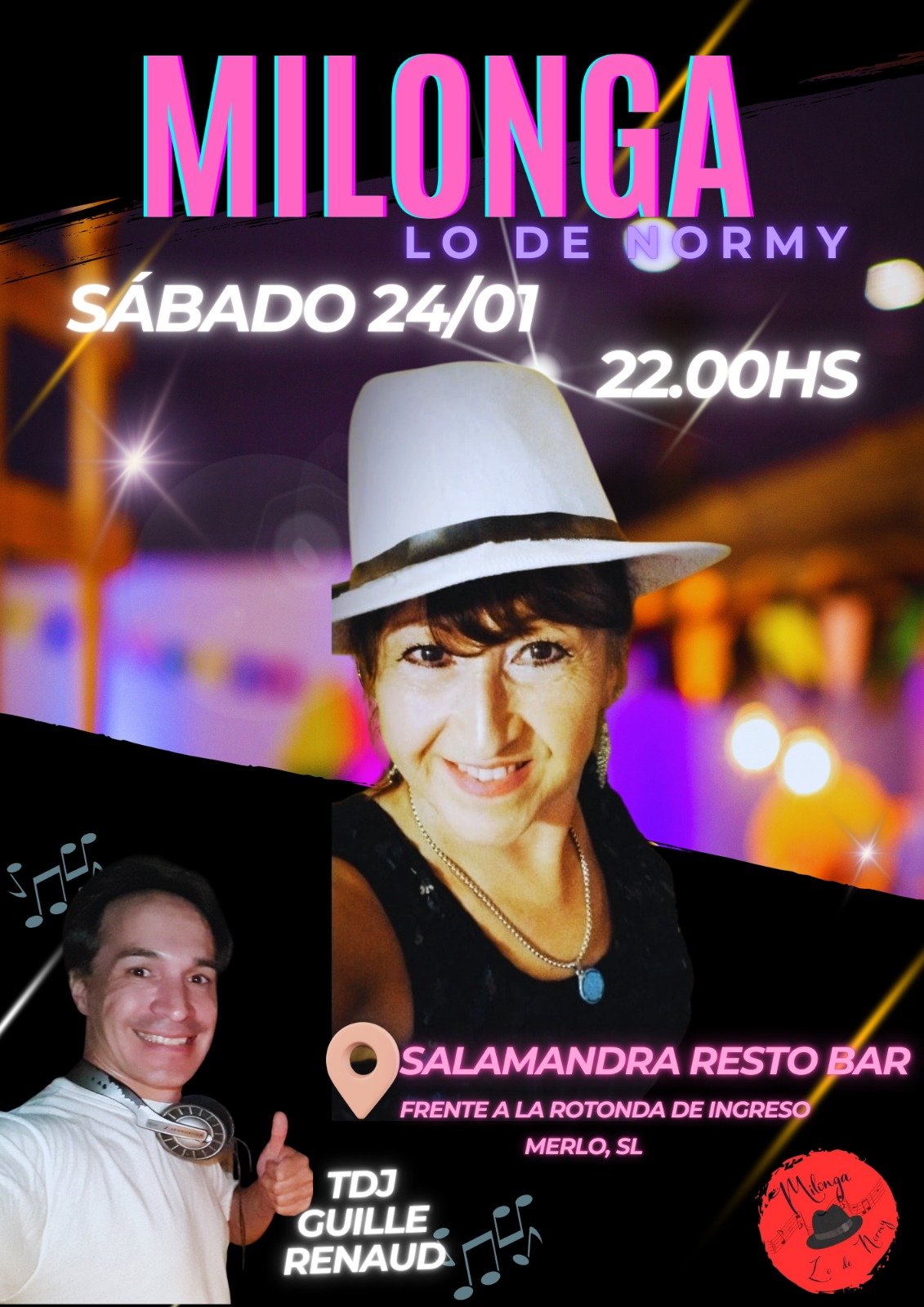 💃✨ INVITACIÓN A LA MILONGA ✨🕺 🎶 MILONGA “Lo de Normy”📅 Sábado 24/01🕙 22.00 hs 📍 Salamandra Resto Bar👉 Frente a la rotonda de ingreso📌 Merlo, San Luis 🎧 TDJ: Guille Renaud✨ Una noche para bailar, encontrarse y disfrutar del mejor tango 💕 ¡Los esperamos para compartir pista 🎼💃🕺