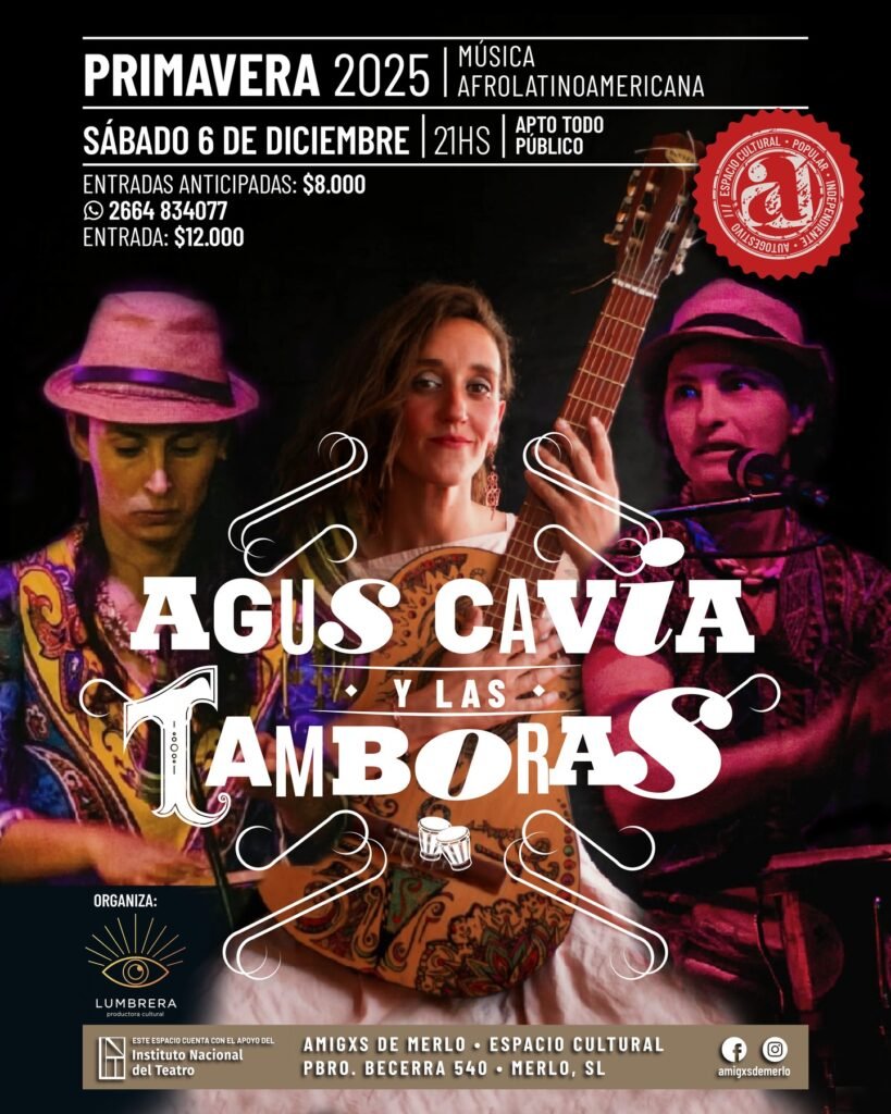 Acompañada por “Las Tamboras”, con Erika Carabajal y Lupe Martínez (Cumbia del Monte, Hijas del Tamal) brindarán un espectáculo que combina los ritmos de la tierra y los cantos del corazón. Habrá artistas invitados especiales que se unirán a Agus Cavia y Las Tamboras en el escenario.