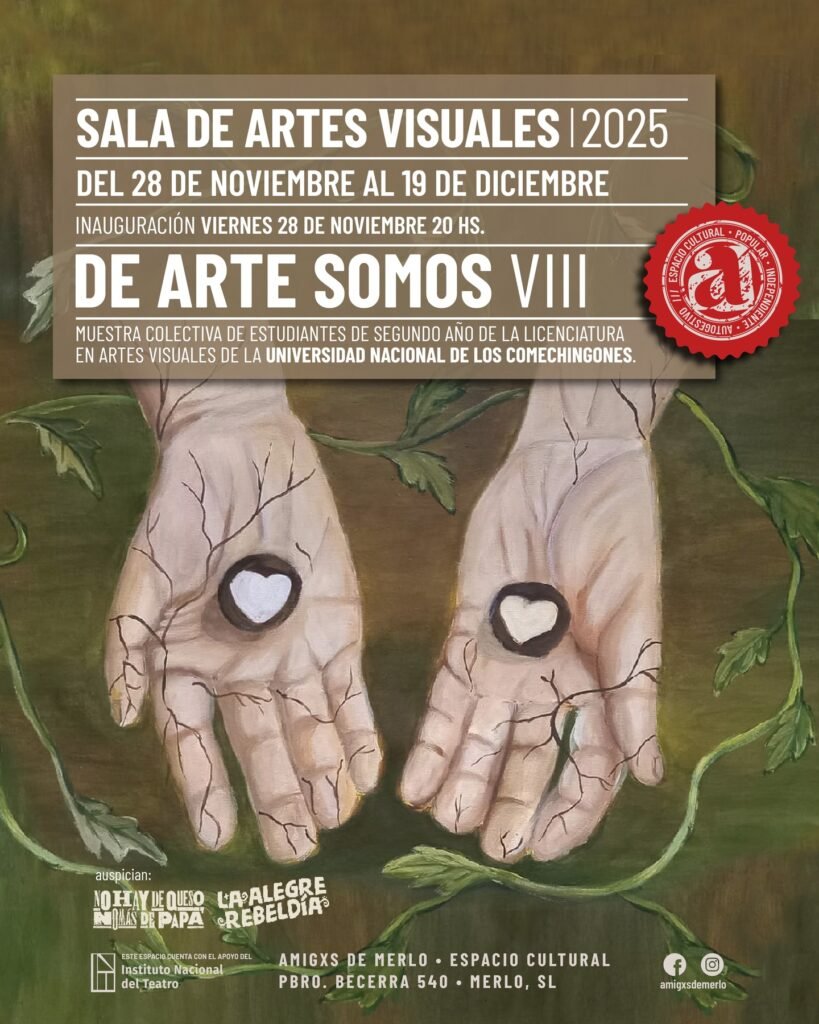 El viernes 28 de noviembre a las 20:00hs., en la Sala de Artes Visuales del Espacio Cultural @amigxsdemerlo se inaugura la Exposición Colectiva “DE ARTE SOMOS VIII”, donde podrás apreciar los trabajos finales de estudiantes de la Cátedra de Dibujo y Pintura II de la Licenciatura en Artes Visuales de la Universidad Nacional de los Comechingones @unlcmerlo