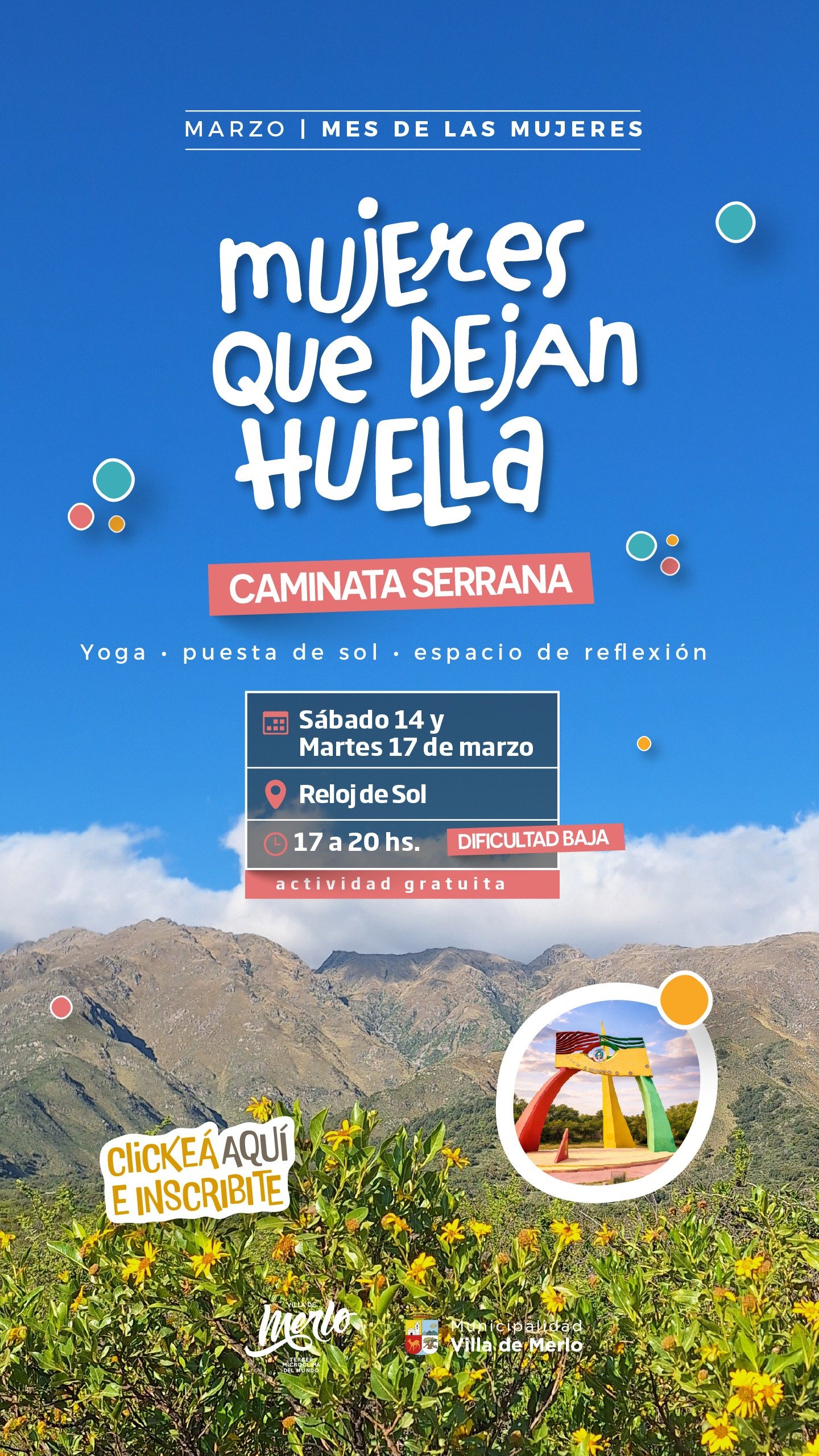 Complementando la actividad de senderismo, la jornada suma un atractivo especial: una vez completado el circuito, se brindará una práctica de Yoga, Tai Chi y Chi Kung, permitiendo una relajación profunda al aire libre. Para finalizar, se invitará a las participantes a un momento de diálogo y reflexión grupal sobre el Día de la Mujer, compartiendo mates mientras se contempla el atardecer serrano.
