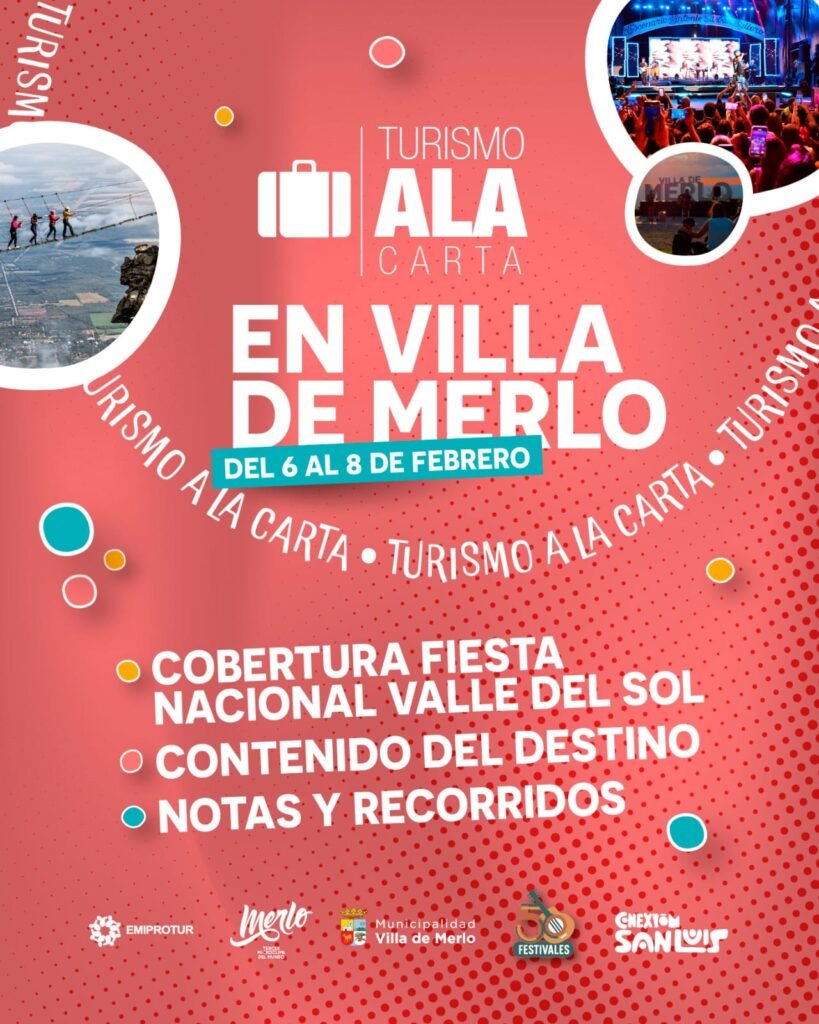 ÚLTIMAS NOTICIAS Merlo y Salta Intercambiaron Experiencias de Gestión Sostenible 04/12/2025 Nueva actualización web: accesibilidad visual para todas las personas 03/12/2025 Dos importantes sellos nacionales destacan el trabajo turístico de Villa de Merlo 03/12/2025 FINDE XXL: Villa de Merlo Logró el 87,62% de Ocupación con un Histórico Impulso Económico 28/11/2025 Villa de Merlo Dice Presente en la 1ra feria provincial de turismo 28/11/2025 Reforzando la Promoción: Dos Reconocidas Producciones Recorren Merlo 27/11/2025 Ya Funciona la Nueva Sección de Alojamientos en la web oficial. 27/11/2025 La Villa de Merlo recibe nuevamente a “Argentinos x Argentina” 20/11/2025 Avanza el trabajo conjunto con comerciantes en el marco del Embellecimiento Urbano 20/11/2025 1 2 3 4 5 … 15 16 17 18 Siguiente »