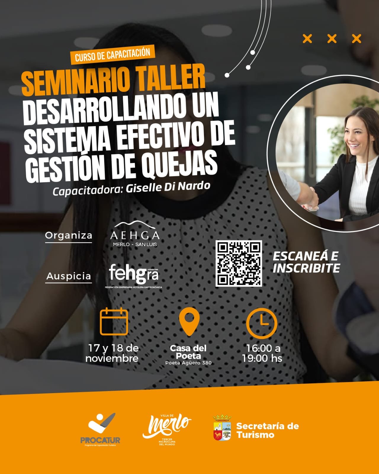 El Seminario–Taller “Desarrollando un Sistema Efectivo de Gestión de Quejas” se realizará los días lunes 17 y martes 18 de noviembre, de 15:30 a 18:30 hs, en la Casa del Poeta.